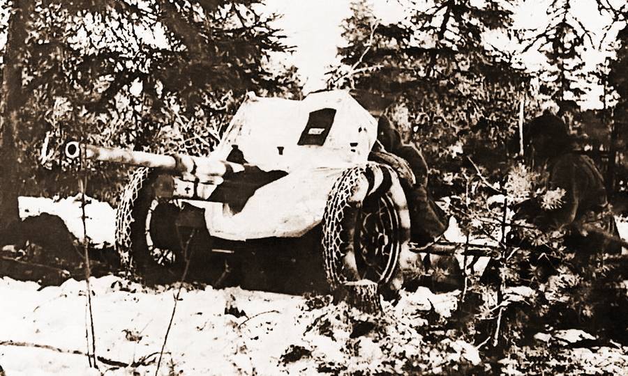 Расчёт 45-мм противотанковой пушка 53-К на Карельском перешейке, советско-финская война 1939–1940 гг. Щит орудия задрапирован белой тканью