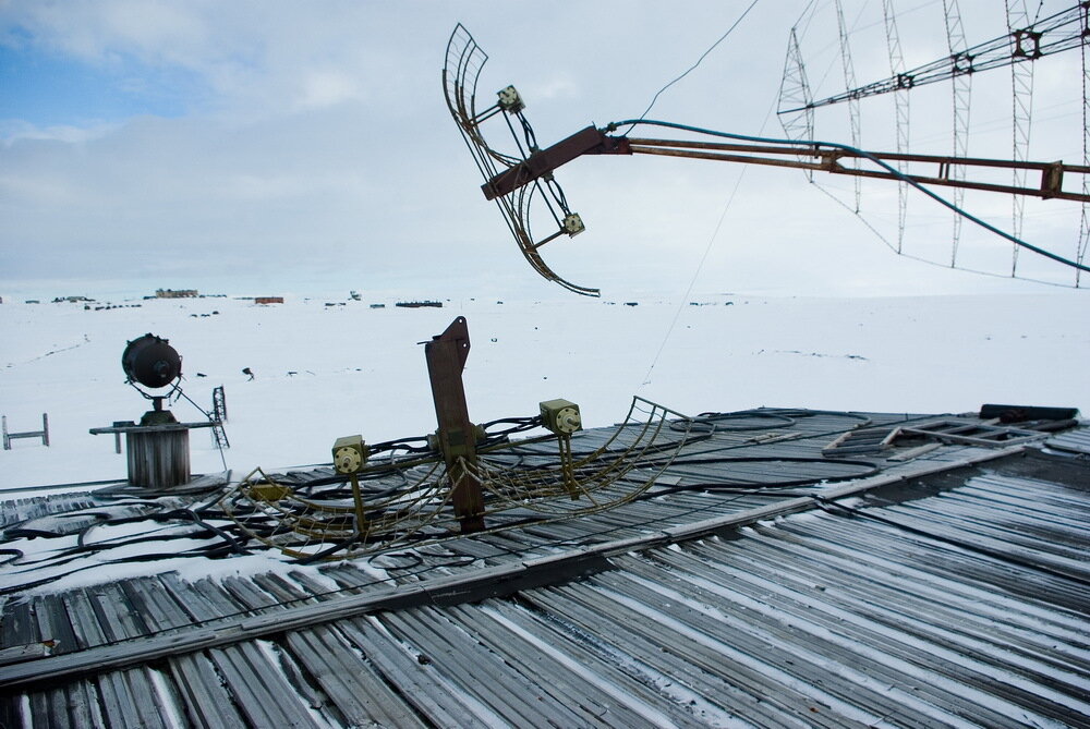 Под антенной расположено здание, но внутрь попасть невозможно из-за снега и многолетнего льда.
