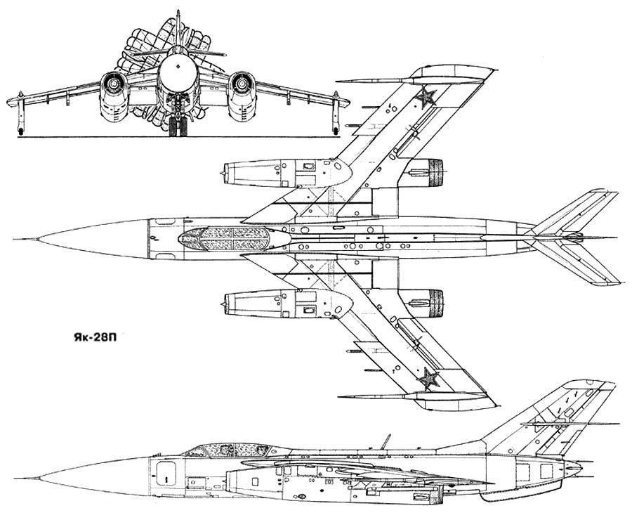 Двухместный сверхзвуковой перехватчик Як-28П предназначался для борьбы с воздушными целями на малых и средних высотах в большом диапазоне скоростей днем и ночью при любой погоде. На Як-28П была предусмотрена возможность применения стартовых пороховых ускорителей. При включенном форсаже и работающих ускорителях разбег составлял всего около 400 м, что в совокупности с высокой скороподъемностью сокращало время выхода на цель. Для сокращения пробега при посадке из подфюзеляжного хвостового гребня выпускалась штанга с датчиком, после касания которым земли сразу же срабатывала система выпуска тормозного парашюта.