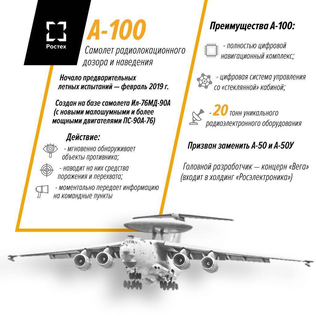 Базой для комплекса стал самолет Ил-76МД-90А с новыми малошумными и более мощными двигателями ПС-90А-76. В общей сложности на этом «Иле» установлено порядка 20 тонн уникального радиоэлектронного оборудования. Оно позволяет А-100 мгновенно обнаруживать, опознавать и классифицировать цели, моментально передавать информацию на пункты управления, для целеуказания корабельным и наземным зенитным средствам.