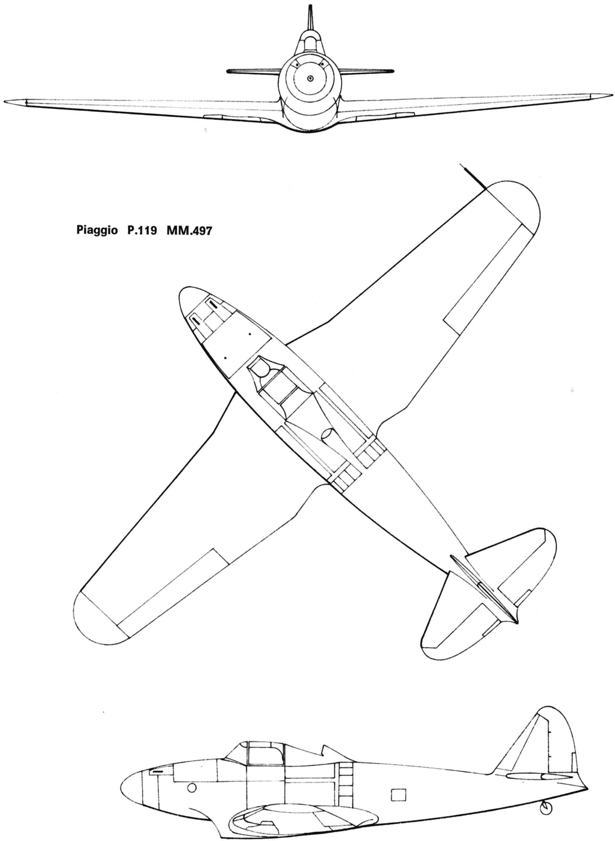 Последней конструкцией Piaggio военного времени, которая действительно поднялась в воздух, стал одноместный истребитель P.119. Подобно почти всем проектам, созданным фирмой, он обладал весьма оригинальной компоновкой. С 1938 года Piaggio изучала возможность установки звездообразного двигателя в середине фюзеляжа с вращением винта посредством удлиненного вала. В конструкторском бюро предполагали, что такая схема обеспечит высокую маневренность (за счет сосредоточения веса близ центра тяжести), отличную аэродинамику и хороший обзор (из-за сужения носа и сдвига кабины вперед), а также концентрацию залпа на цели сосредоточением стволов в одном месте.