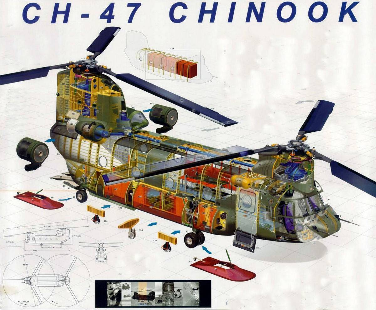 Вертолёт CH-47 «Чинук» построен по традиционной для аппаратов Piasecki схеме с двумя продольными несущими винтами. Схема отлично подходит транспортникам — можно получить вместительный отсек и максимально использовать его объём. Правда, за счёт усложнения конструкции и худшей маневренности.