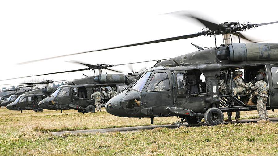 Американские вертолеты UH-60 Blackhawk на полигоне Графенвер в Германии