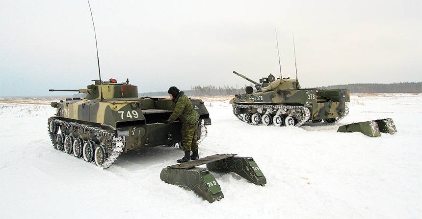 - одним (БМД-2) или двумя (БМД-1) курсовыми пулемётными установками в передней части корпуса;