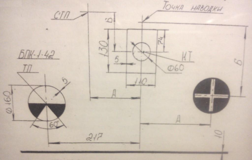 – поворотным и подъемным механизмами навести вершину прицельного угольника прицела БПК-1-42 в точку прицеливания “БПК-1-42” на мишени, предварительно совместив подвижной индекс шкалы ПКТ с маркой 6. Наводку производить слева направо и снизу вверх.