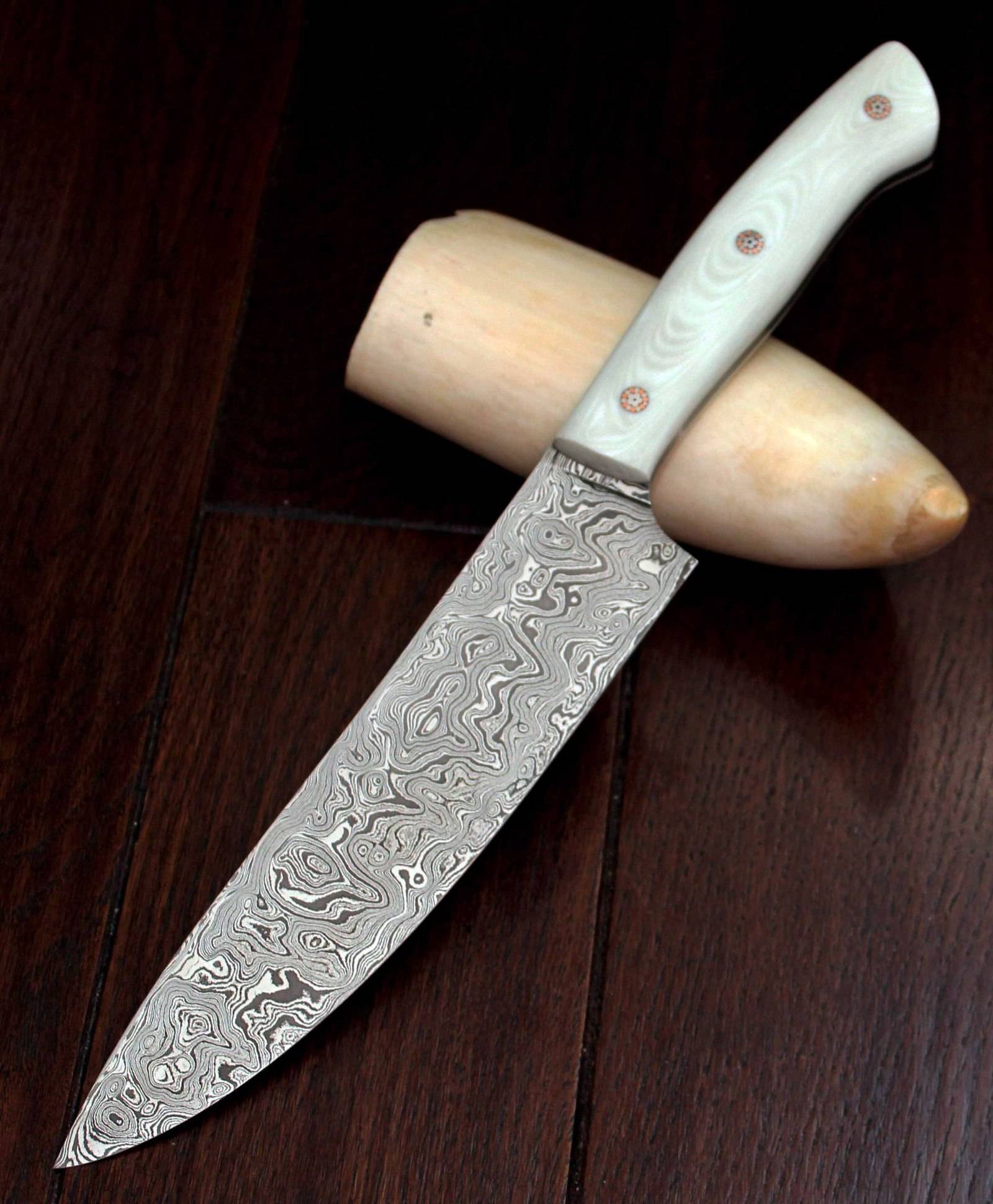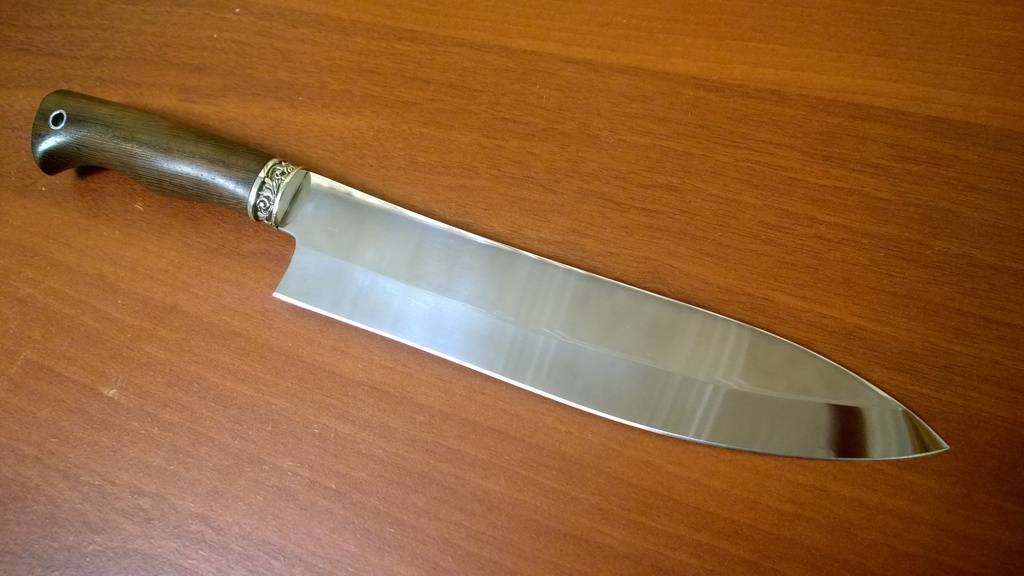 Рукоятки из металла выглядят дорого и солидно, но для кухонного ножа их использовать не рекомендуется. Изделие с такой ручкой будет весить в 2 раза больше, металл скользит в руке, что несет риск травмы. При работе возле плиты такая ручка нагреется, она подвержена ржавчине при долгом нахождении во влажной среде. Можно комбинировать сталь со вставками из дерева или кожи, такое изделие будет комфортно лежать в руке.