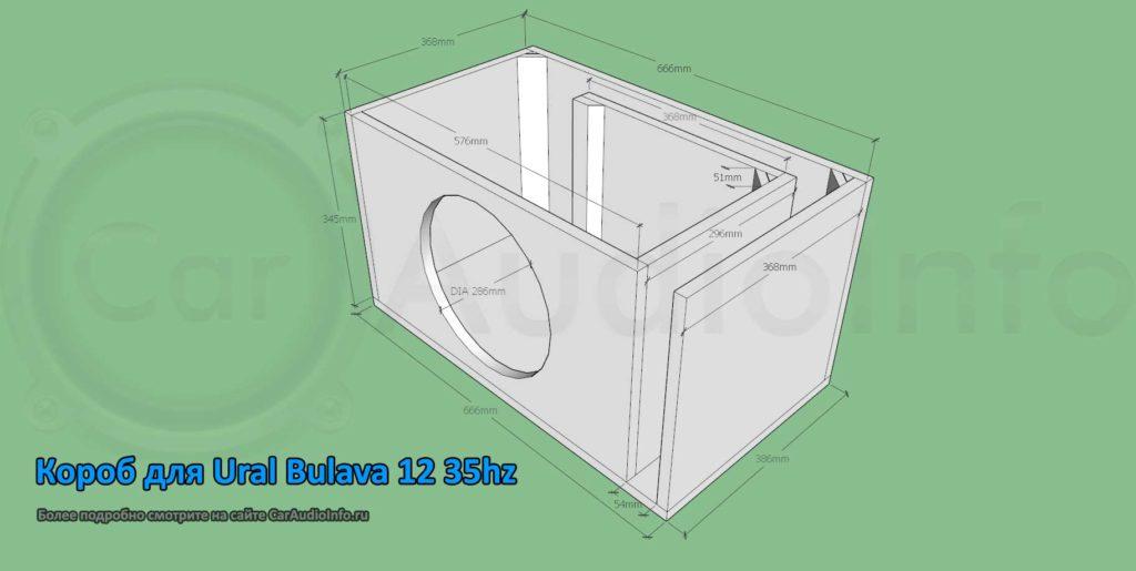 Сабвуферный динамик — URAL (Урал) Bulava 12;Настройка короба — 35Hz;Чистый объём — 54 л;Грязный объём — 75 л;Площадь порта — 185 см;Длинна порта 70 см;Ширина материала короба 18 мм;Расчёт производился для седана среднего размера.