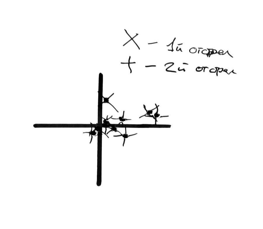 100-метровая мишень с испытаний на сдвиг точки попадания при снятии и установке ствола. Какого-либо смещения двух групп («до» и «после») — не заметно