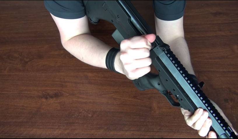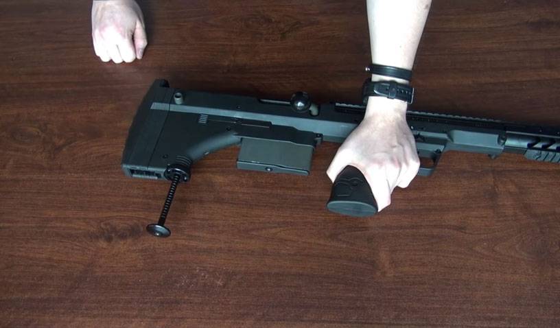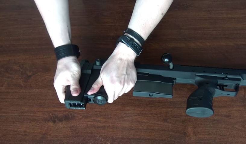 Задник приклада состоит из нескольких частей, которые можно убрать или прицепить для регулировки длины приклада, как у боевого прототипа.