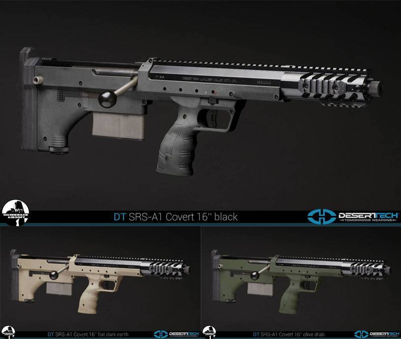 SRS A1 Covert — с коротким цевьем и 16″ внешним стволом длиной 420 мм. Общая длина винтовки 675мм, вес 3.00 кг. Ценник — $450