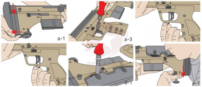 Все металлические детали сделаны из стали и алюминия методом фрезеровки. Неметаллические части (например ложе) сделаны из качественного ударопрочного пластика.