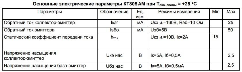 Кроме предельно допустимых значений, в даташит на КТ805АМ указаны электрические значения. В них каждый параметр приводится с учётом определенных режимов измерений, указанных в отдельном столбце. Температура вокруг корпуса прибора при этом составляет не более +25 OС: