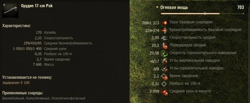 способна ввергнуть в страх и ужас любой танк в игре. Разовый урон от каждого выстрела из этого орудия составляет 788-1313 HP. При этом JagdPz E-100 за счет высокого калибра, легко толщиной до 224-374 мм. Боевая машина способна стрелять с частотой 2,33 выстрела в минуту.