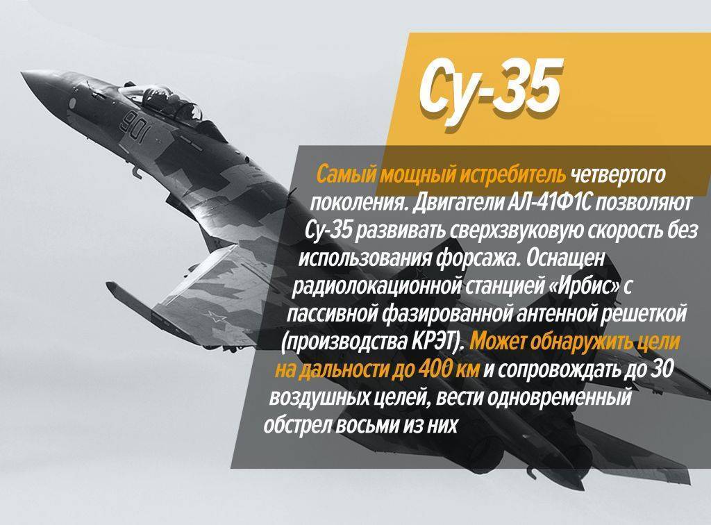 В частности, новые двигатели АЛ-41Ф1С позволяют Су-35 развивать сверхзвуковую скорость без использования форсажа. Также «тридцать пятый» оснащен радиолокационной станцией «Ирбис» с пассивной фазированной антенной решеткой. Несмотря на отсутствие АФАР, «Ирбис» производства КРЭТ может обнаружить цели на дальности до 400 км, а также сопровождать до 30 воздушных целей и вести одновременный обстрел восьми из них.