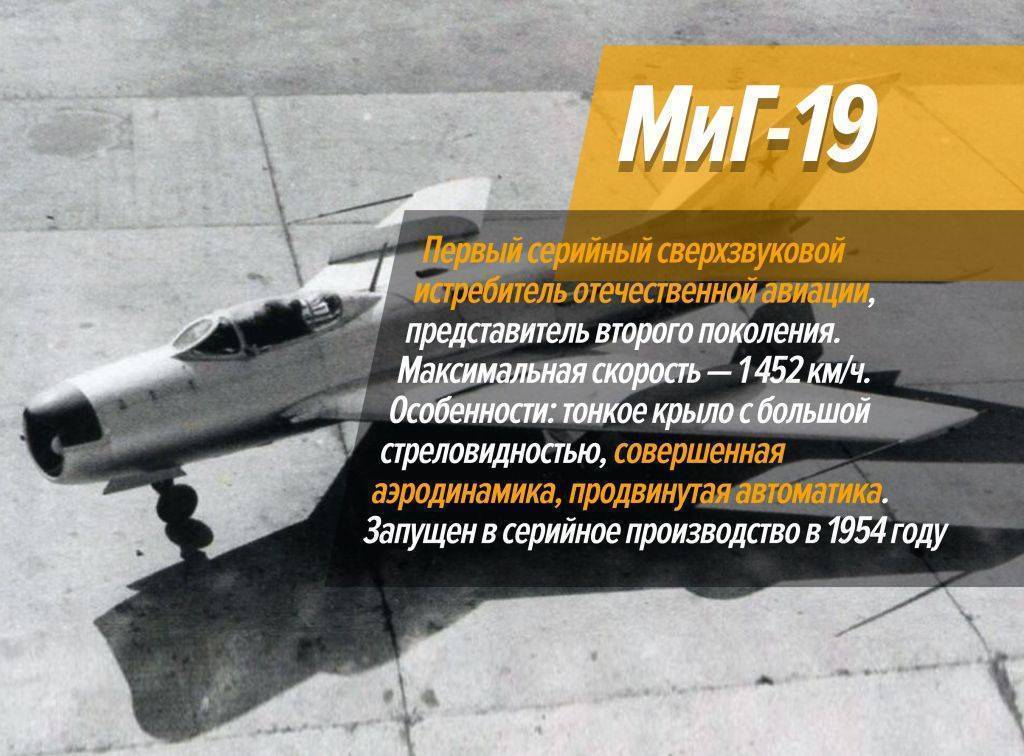 Серийное производство МиГ-19 началось в октябре 1954 года, а уже 3 июля 1955 года 48 новых «МиГов» участвовали в воздушном параде в Тушино. Работа над МиГ-19 и созданием его модификаций стала хорошей школой для отечественных авиаконструкторов, летчиков-испытателей. Этот опыт в будущем позволил перейти к МиГ-21, а позже и к легендарному МиГ-25, который развивал скорость, почти втрое превосходящую скорость звука.