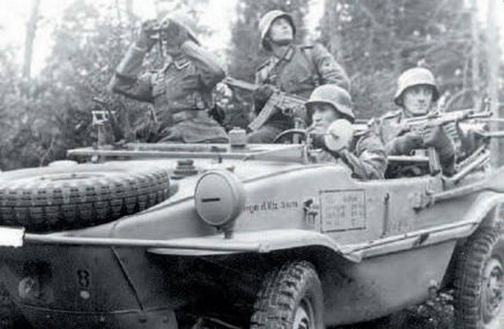 Пехотинцы дивизии „Великая Германи“ в плавающем автомобиле. Солдаты на заденем сиденье с новой штурмовой винтовкой