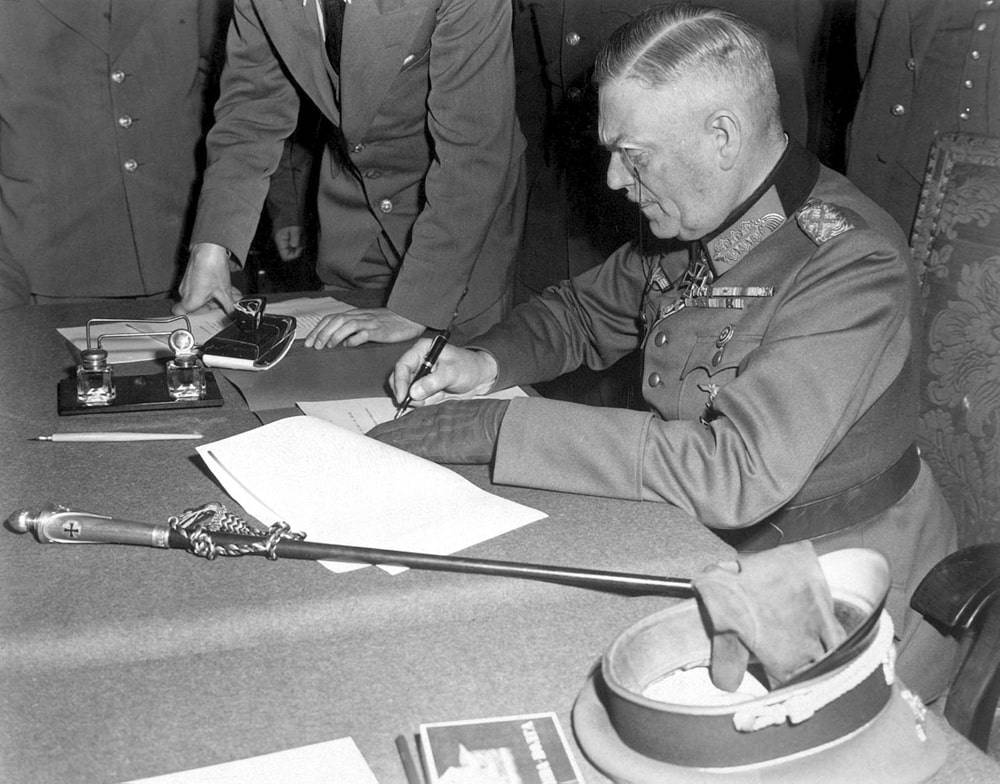 Генерал-фельдмаршал Вильгельм Кейтель подписывает акт о безоговорочной капитуляции германского вермахта в штабе 5-й ударной армии в Карлсхорсте, Берлин