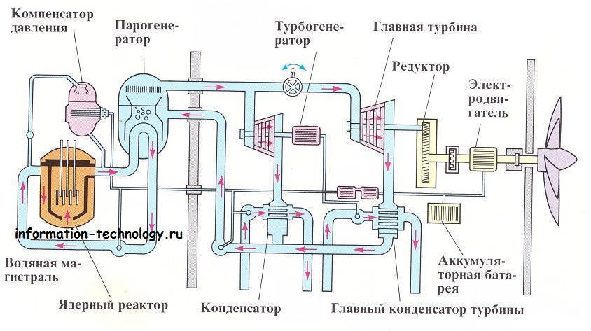 В типичном двигателе с ядерным реактором (слева) охлажденная вода под давлением попадает внутрь корпуса реактора, содержащего ядерное топливо. Нагретая вода выходит из реактора и используется для превращения другой воды в пар, а затем, остывая, вновь возвращается в реактор. Пар вращает лопасти турбинного двигателя. Редуктор переводит быстрое вращение вала турбины в более медленное вращение вала электродвигателя. Вал электродвигателя при помощи механизма сцепления соединяется с гребным валом. Кроме того, что электродвигатель передает вращение гребному валу, он вырабатывает электроэнергию, которая запасасется в бортовых аккумуляторах.