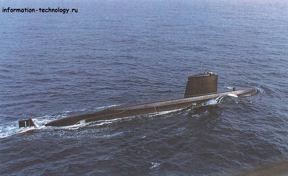 Атомная подлодка курсирует вдоль побережья в надводном положении. Таким кораблям надо пополнять топливо лишь один раз в два-три года.