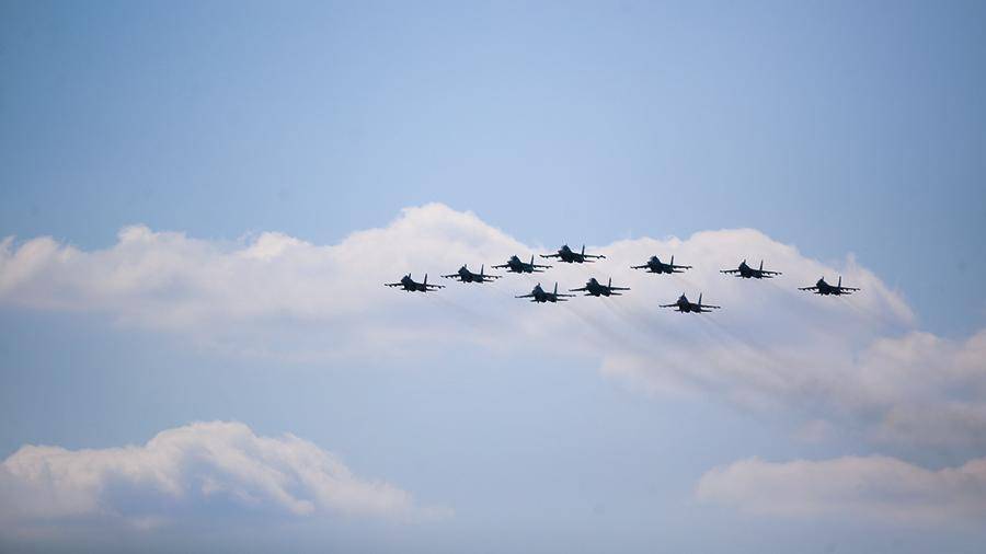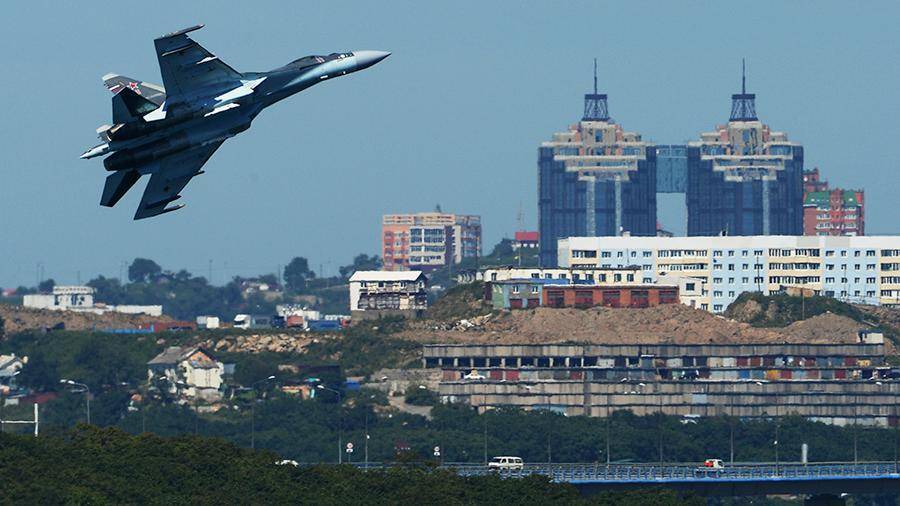 Истребитель Су-35C Восточного военного округа во время тренировочного полета над бухтой Аякс во Владивостоке
