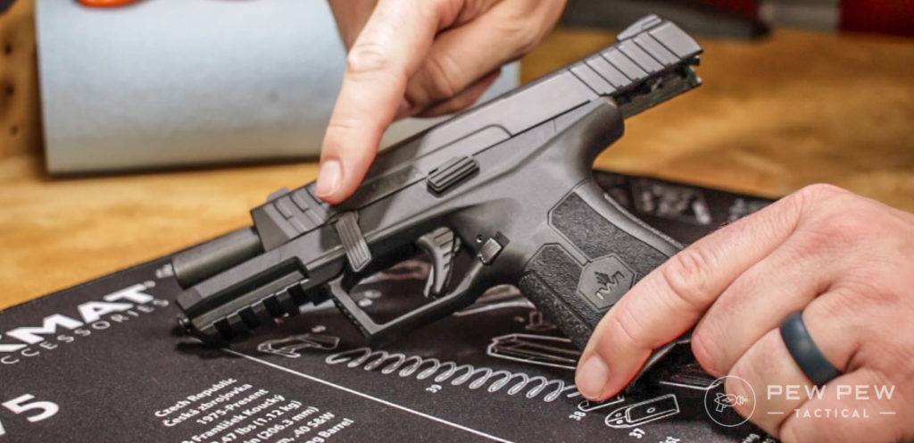 Насечка на затворе имеется как задняя, так и передняя. Производитель заявляет о низком расположении центральной оси ствола над затыльником рукоятки, что уменьшает подброс при выстреле и положительно сказывается на скорости возврата оружия на прицельную линию после выстрела. Ударно-спусковой механизм ударникового типа, с предварительно взведённым ударником. Усилие спуска от 2,5 до 3,1 кг.