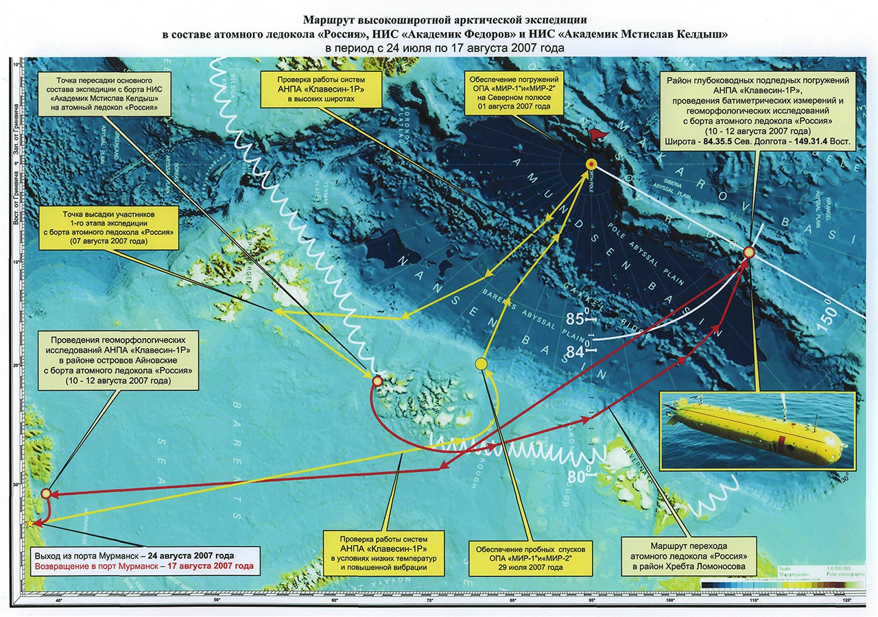 События лета 2007 года, связанные с научно-исследовательскими экспедициями на хребет Ломоносова и на Северный полюс получили большой резонанс за рубежом: на научно-исследовательском судне «Академик Фёдоров» и на атомоходе «Россия» наши специалисты выполнили комплекс исследований на хребтах Ломоносова и Менделеева в Северном Ледовитом океане с целью определения внешних границ континентального шельфа, богатого запасами нефти и газа, а также выполнили спуски батискафов «Мир» в географической точке Северного полюса.