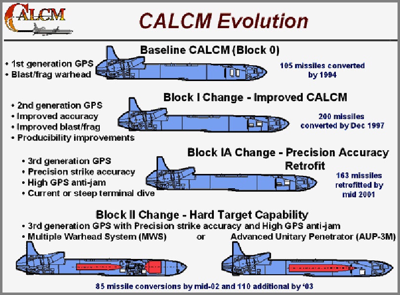 Базовый вариант ракеты AGM-86C имеет обозначение CALCM Block 0. Впоследствии у ракеты CALCM была доработана система наведения. Первый испытательный полёт с использованием только спутниковой навигации GPS был произведён в декабре 1997 года. Модифицированная CALCM (Block I и II) производилась подразделением Integrated Defense Systems на заводе в городе Сент-Чарльз (штат Миссури).