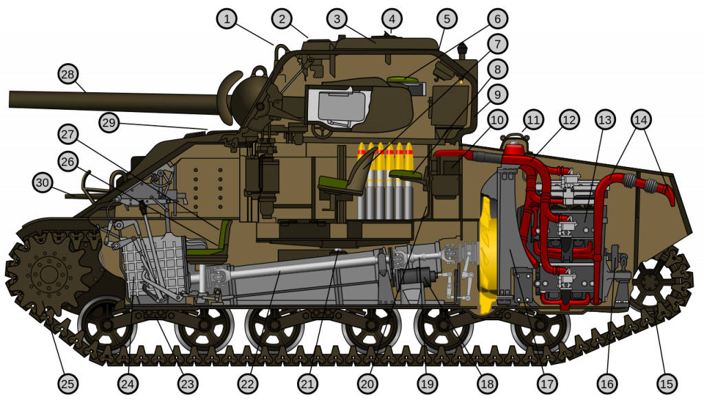 Танк «Шерман» выполнен по схеме, более характерной для немецкого танкостроения тех лет: его трансмиссия и отделение управления размещены в передней части корпуса, а моторное отсек – в задней. Между ними расположено боевое отделение с башней кругового вращения, которая находится по центру корпуса. В состав экипажа входило пять человек.