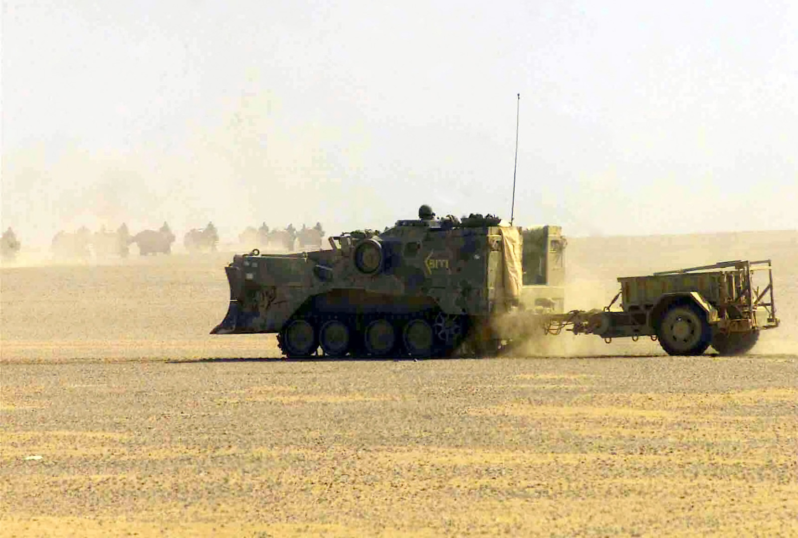 An ACE of the 5th Marine Regiment, tows a ‘MICLIC’ trailer across the desert in Kuwait. Photo: Lance-Corporal Andrew P. Roufs