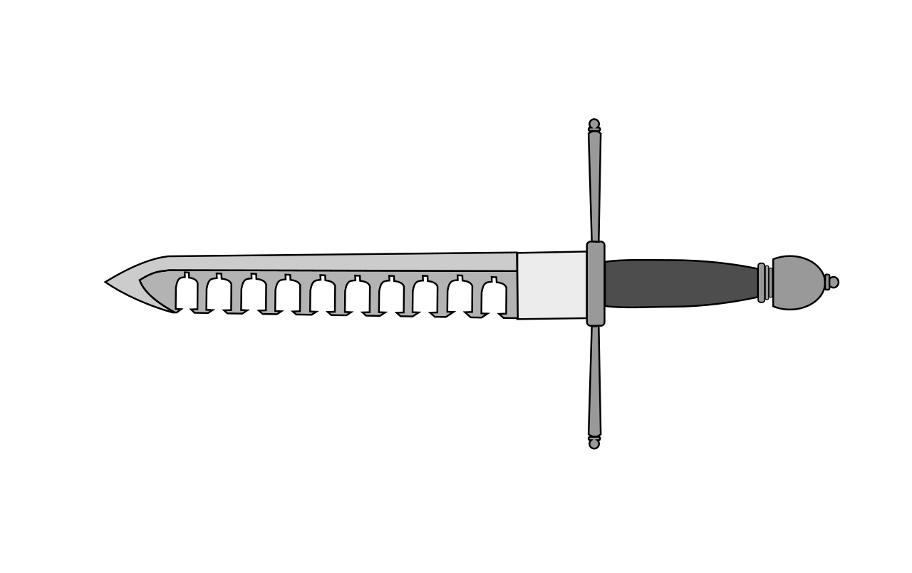 Мечелом – защитное вспомогательное оружие, которое использовалось в паре с длинным мечом или рапирой. Глубокие зубцы на одной из сторон лезвия предназначались для того, чтобы ловить вражеский клинок или вырывать его из рук.