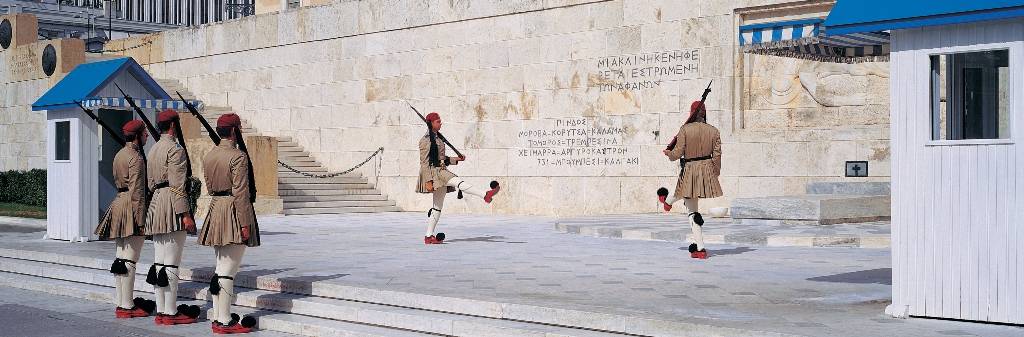Такую униформу изготовляют в пошивочной мастерской Президентской гвардии. Караул на могиле неизвестного солдата меняется каждый час, и всякий раз на это зрелище приходят посмотреть туристы и местные жители. Смотрится смена очень эффектно, особенно благодаря особому шагу, который разучивают эвзоны. Эти солдаты относятся к элитному подразделению пехоты греческой армии.