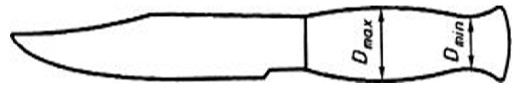 Разделочный и шкуросъёмный | Допустима травмобезопасная рукоять при толщине клинка при толщине обуха до 2,4 мм включительно | Вариант допустимой бочкообразной травмобезопасной рукояти без ограничителя с разницей минимального и максимального диаметров свыше 8 мм