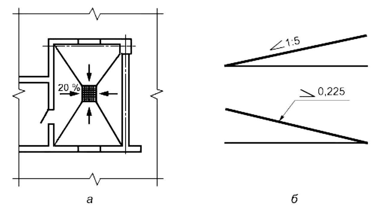 5.4.4 На планах направление уклона плоскостей указывают стрелкой, над которой при необходимости проставляют числовое значение уклона в процентах в соответствии с рисунком 7а или в виде отношения единицы высоты плоскости к соответствующей горизонтальной проекции (например, 1:7).