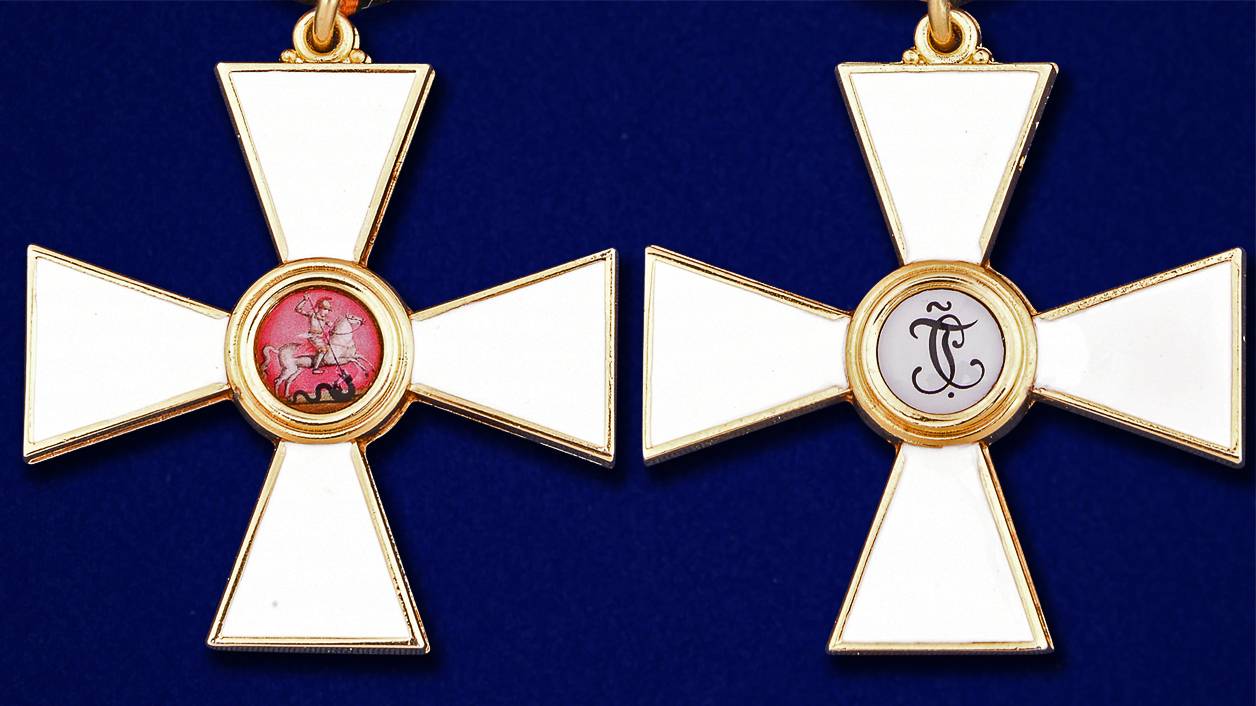 1 ст. – белый эмалевый крест с расширяющимися концами, с золотой каймой по краям. В середине, на медальоне, в красном эмалевом поле изображение Святого Георгия на коне, поражающего копьем змея. На оборотной стороне медальона изображен вензель святого: СГ. Носился на чресплечной ленте у бедра.