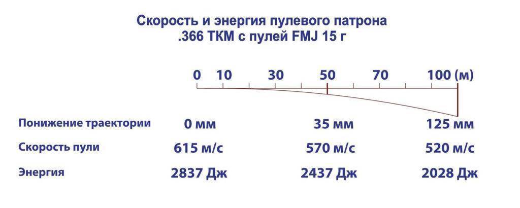- На дистанции 100-150 метров патрон 366ТКМ обладает лучшим останавливающим действием, чем базовый нарезной патрон 7,62×39 мм., из-за большего диаметра и массы пули.