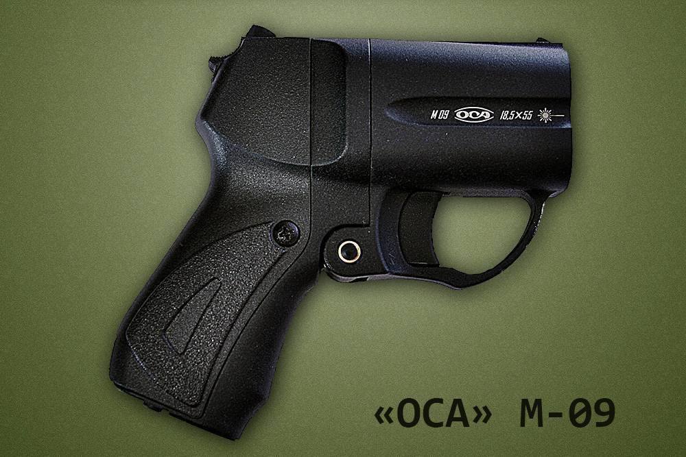- М-09 — один из травматических бесствольных пистолетов «Оса». В отличии от предыдущих версий, в этой сделана высоконадежная микросхема уменьшенного размера.Для лучшей видимости при прицеливании установлен лазерный луч зеленого цвета. Сенсор указателя цели контролируется силой сжимания рукоятки. При пережимании рукояти происходит включение лазерного луча в автоматическом режиме, если хват рукоятки слабый — луч выключается.В пистолете М-09 используются патроны калибра 18,5 мм и длиной гильзы 55 мм различного действия: