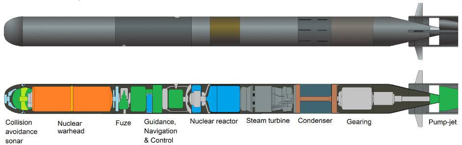 Speed: The claimed speed of 100 knots (185 kph) is incredibly fast for a torpedo. The leaked cutaway drawing shows that there is a nuclear reactor coupled with a steam turbine driving a propeller shaft so we know that it is not a rocket type weapon. At these speeds there would be vibration and stability problems for the designers to overcome. For the moment 100kt seems too fast but we will have to wait and see if the specifications become more realistic.