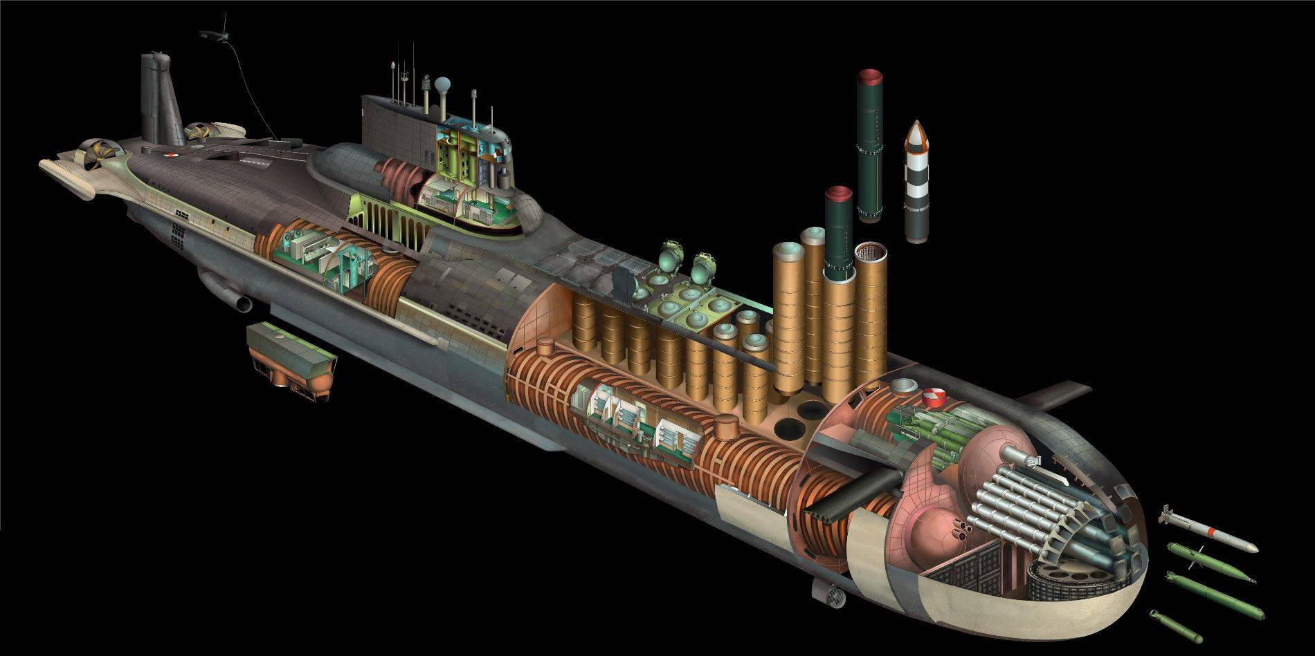 Снаружи «Акула» единый корабль, но внутри это катамаран: 2 прочных корпуса из титана внутри легкого обеспечили надежность конструкции и размещение 20 баллистических ракет залпового пуска, на которых приходилось 200 ядерных боеголовок.