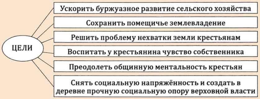 В результате можем говорить о том, что аграрная реформа Столыпина была одним из этапов массового реформирования России. Это реформирование должно было в корне изменить страну, переведя ее в разряд одной из ведущих мировых держав не только в военном смысле, но и в смысле экономическом. Главная же задача данных реформы заключалась в том, чтобы разрушить общины крестьян, создав мощные фермерские хозяйства. Правительство хотело увидеть сильных собственников земли, в которых бы выражались не только помещики, но и частные хозяйства.