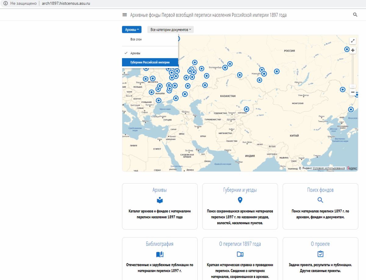 Система, которая позволяет на карте наглядно увидеть сохранность и доступность документов, касающихся Первой Всероссийской переписи населения 1897 года. Сайт имеет несколько разделов.
