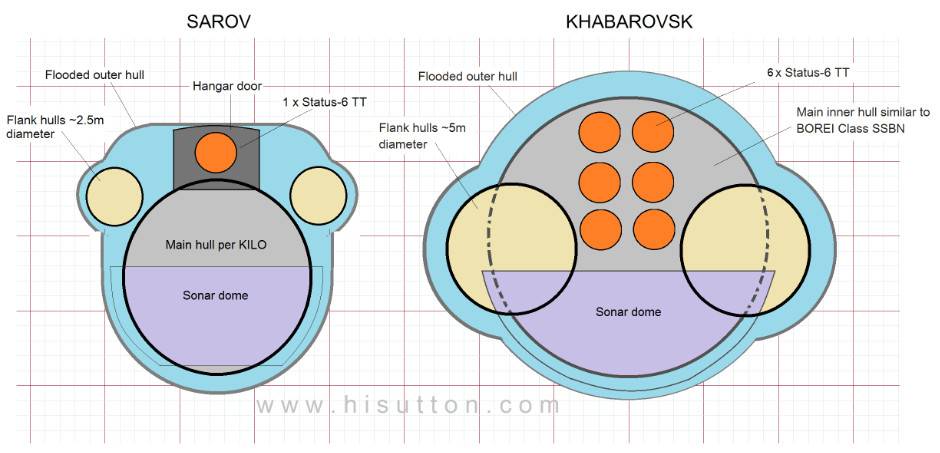 The leaked graphic strongly hints toward the KHABAROVSK having two side-by-side hulls in the bow. This is a highly unusual arrangement but is actually not dissimilar to the Project 20120 SAROV submarine used to test the Status-6. The basic reason behind this arrangement is that the torpedoes have to fire forward, and are carried externally to the occupied pressure hulls. Therefore a stack of six massive torpedo tubes occupied the space where the forward pressure hull would ordinarily be, thus shifting occupied space into smaller hulls either side.