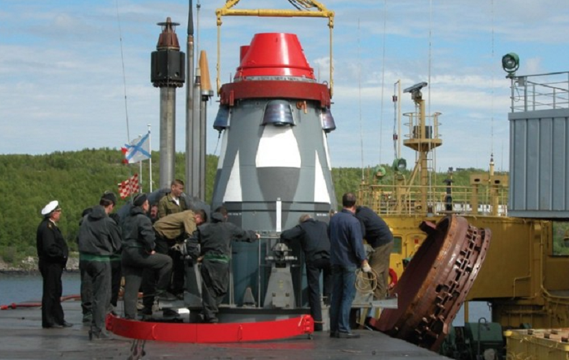- Погрузка МБР Р-29РМУ2.1 «Лайнер» в шахту атомного подводного крейсера проекта 667БДРМ