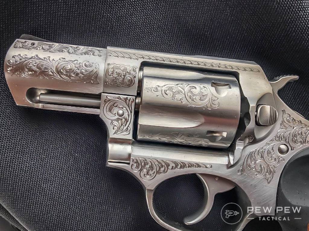 This potent little gun is as cool as Steve McQueen in the Magnificent Seven. The engraving and wood grips harken back to a day when five rounds were enough to solve your issues. You’d roll a cigarette and smoke it when you needed to reload.