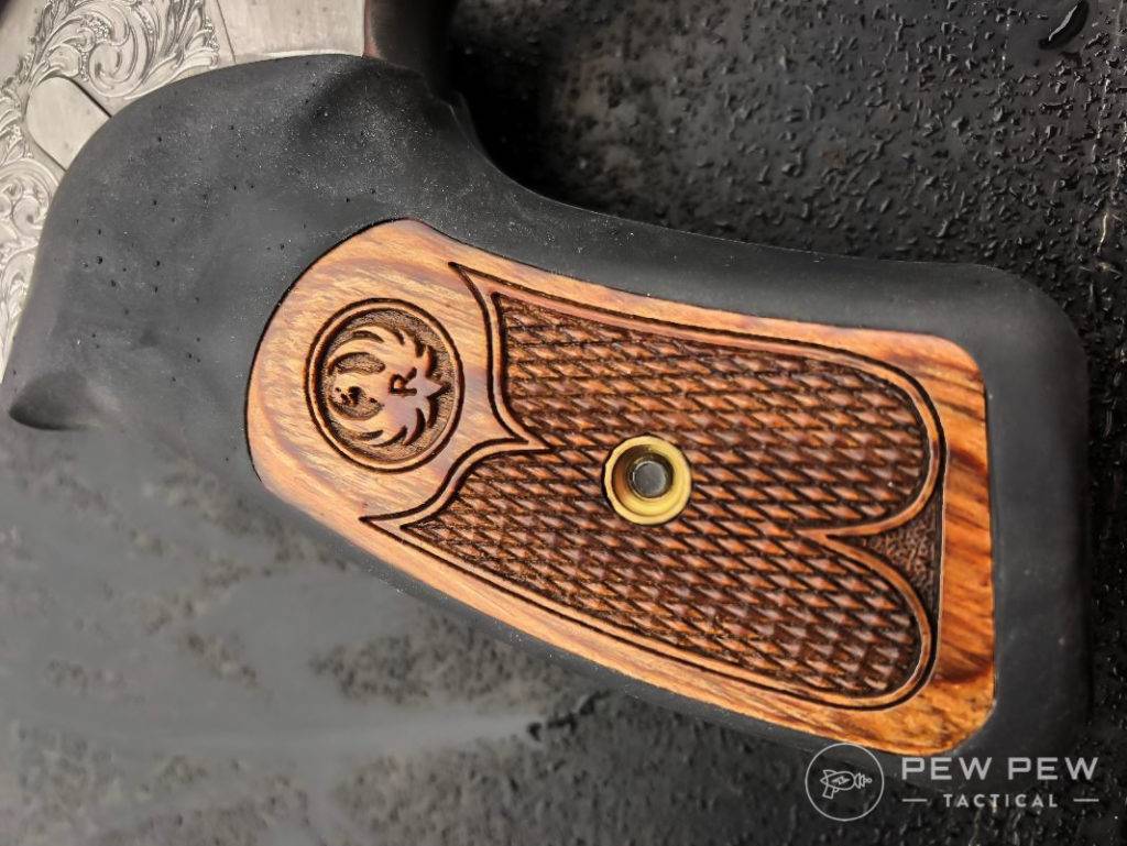 To start, the all steel frame and cylinder sport traditional engraving. For my tastes, this classic touch is beautiful. Add to that a cushioned rubber grip with hardwood inserts and you have a handle that is as attractive as it is functional. The wood of the grip also features the omnipresent Ruger eagle.