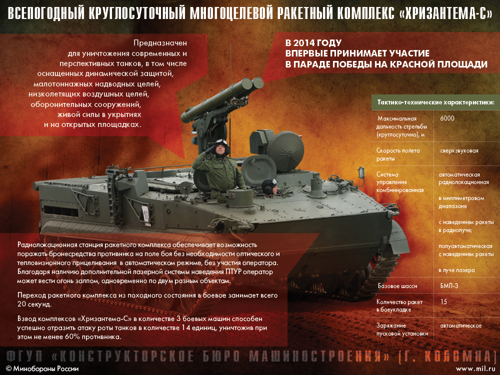 «Достоинством гусеничного шасси «Хризантемы-С» является возможность движения в колоннах и боевых порядках вместе с танками без всяких ограничений по бездорожью. Второй момент: гусеничное шасси БМП-3 — плавающее. Таким образом, «Хризантема-С» может вести огонь на ходу, с места и находясь на водной поверхности», — пояснил в комментарии RT кандидат военных наук Сергей Суворов.