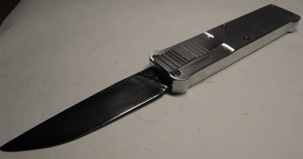 Оружейники изготавливают фронтальный автоматический нож с зажимом лезвия. Замки фиксации рабочего положения бывают нескольких видов: