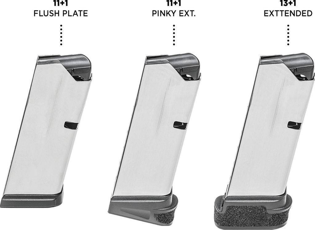 Hellcat поставляется с 2 магазинами: запатентованным магазином на 11 патронов и увеличенным магазином на 13 патронов. Общая масса пистолета в версии OSP с 11-зарядным магазином составляет 504,6 г.