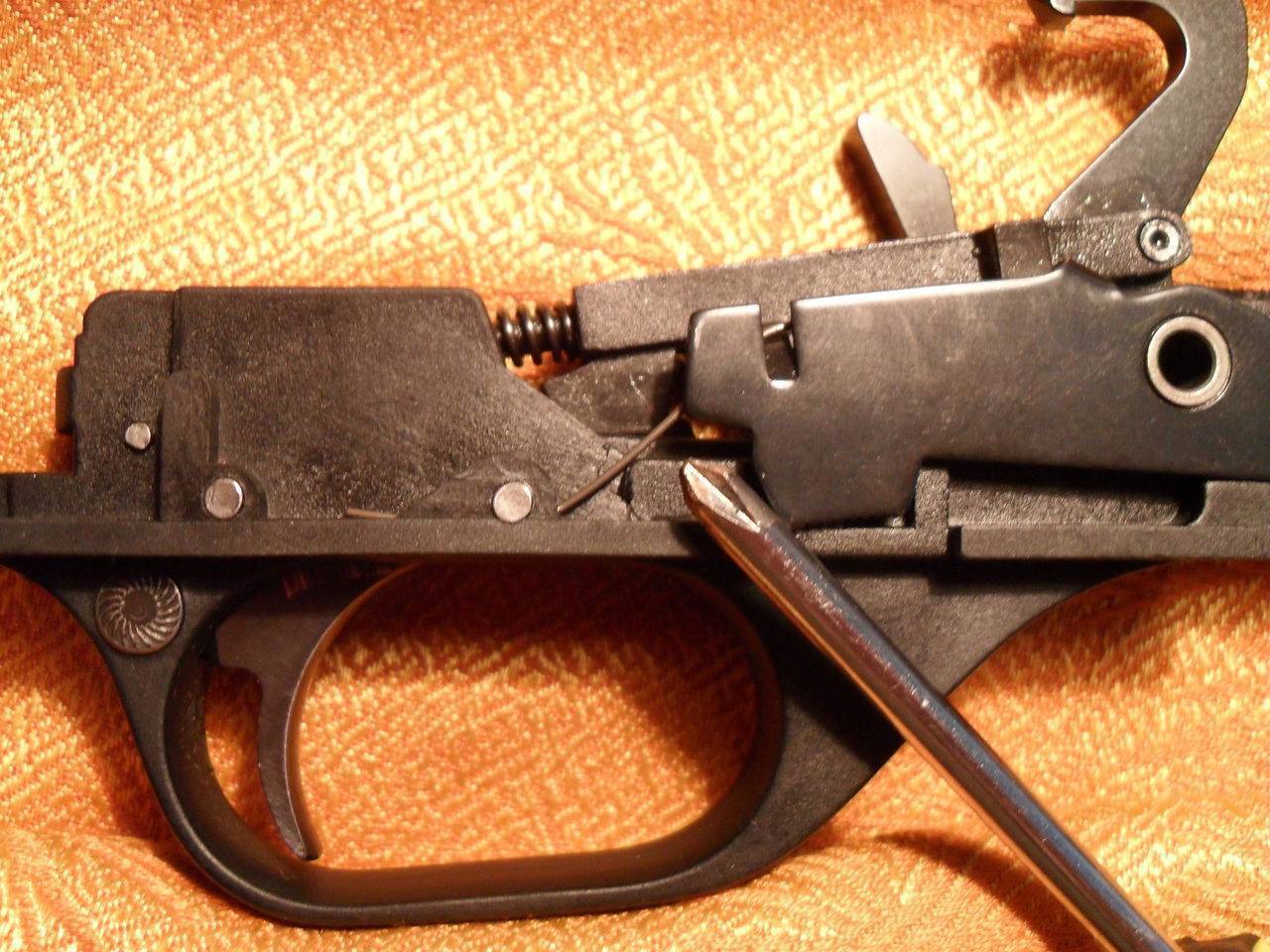 - В момент выстрела затвор оружия движется назад, при этом он тянет за собой край возвратной пружины. Для этого используются специальные двусторонние тяги;