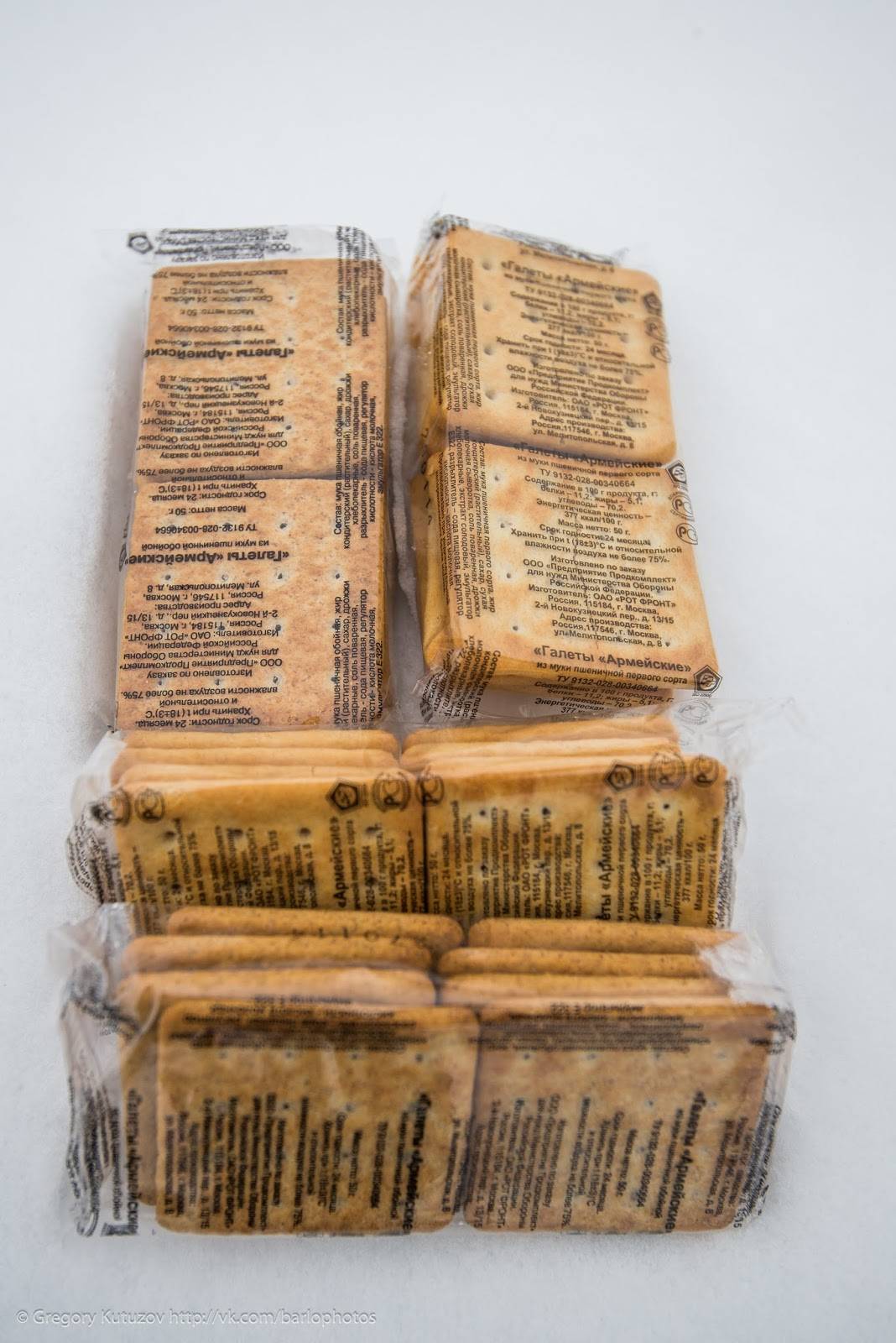 Классика жанра – галеты армейские, 4 упаковки. 2 упаковки из муки 1-ого сорта и 2 упаковки из муки обойной. Пресные печеньки, которые можно использовать вместо хлеба. На них можно намазать паштет, и получится бутерброд, а можно повидло, и будет десерт. Очень много функциональны. Но не советую есть их без всего, как обычный хлеб, лучше все-таки чем-то смазать.