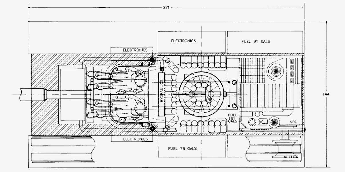 Много внимания в проекте уделялось эргономике работы экипажа и его защите. Не забыли и про контроль за полем боя. Помимо обычных смотровых приборов и бортовых камер каждый член экипажа получил выдвижную бронированную камеру на штанге. Этим перископом цели можно было обнаружить, даже находясь в низине или за укрытием, вроде одноэтажного дома. В качестве основного вооружения выбрали 135-мм пушку с жидким метательным веществом. Отказ от 140-мм калибра объяснили возможностью хоть немного, но сэкономить на размере автомата заряжания, а разницу в огневой мощи компенсировали более мощным метательным веществом.